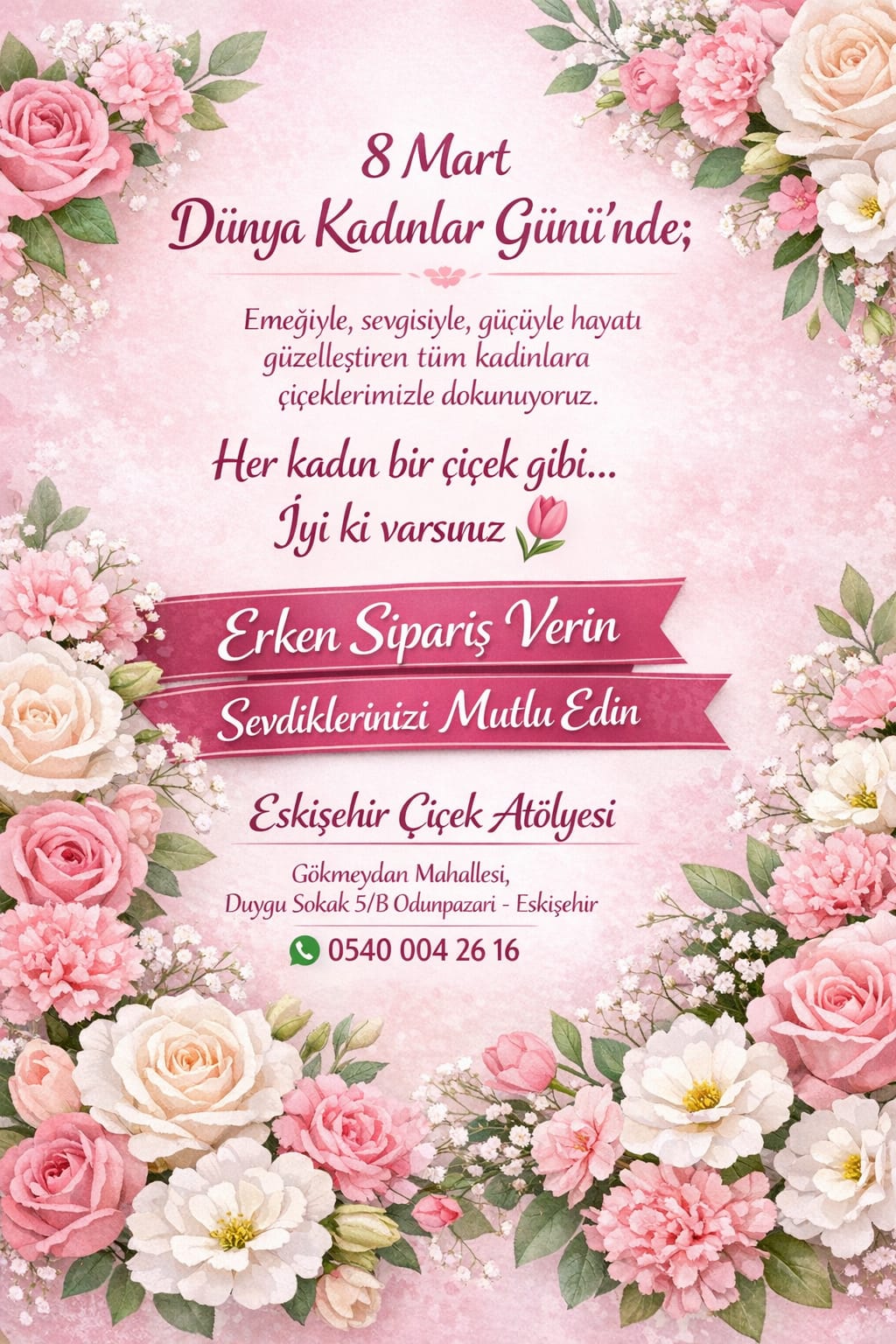 Çiçekleriniz Eskişehir’deki yerel atölyemizde, taze çiçeklerle ve özenle hazırlanır.